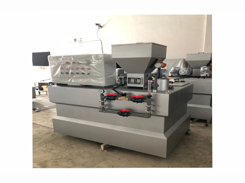 干粉絮凝劑從螺旋推進器內進入速溶器內與清水進行預混,被濕潤的物料進入配制槽進行攪拌稀釋,按要求濃度進行配制;配制過程中,進水量在流量計觀測下必須相對穩定,從而保證在整個工作過程中,配制溶液濃度不變。